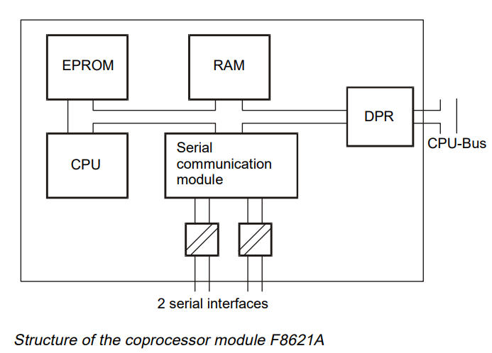 تشمل الوظائف الأساسية: – 384 كيلوبايت من الذاكرة الثابتة، CMOS-RAM، وEPROM موزعة على اثنين من الدوائر المتكاملة. وحدة مراقبة مصدر الطاقة F 7131 مع وحدة تزويد طاقة RAM ببطارية مؤقتة . – واجهتان RS-485 (نصف مزدوج) مع عزل كهربائي ومعالجات اتصال متكاملة. معدلات الإرسال (قابلة للتكوين برمجيًا): 300، 600، 1200، 2400، 4800، 9600، 19200، 38400، 57600 bps ، أو القيم المحددة عبر مفاتيح DIP على وحدة CU. – ذاكرة RAM بمنفذ مزدوج للوصول السريع إلى ذاكرة الوحدة المركزية الثانية. متطلبات المساحة: 4 TE بيانات التشغيل: 5 فولت تيار مستمر، 360 مل أمبير